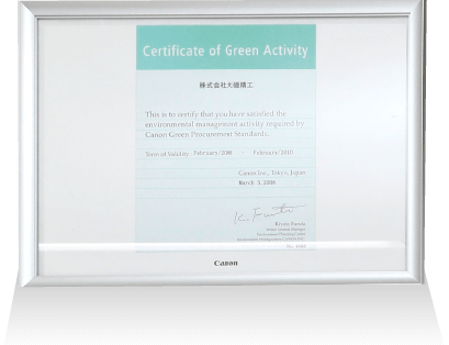 地球環境保全活動を推進するため、資源を調達する際、より環境負荷の少ない材料や部品、製品を優先的に調達することが求められることから、メーカーではグリーン調達基準を定めている。私たちの環境負荷を低減するための仕組みである環境マネジメントシステムの構築や法規制の遵守、使用禁止物質の不使用、削減対象物質の使用削減等が大手精密機器メーカーから認められ、「Certificate Of Green Activity」の認証を受けている。