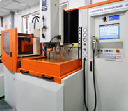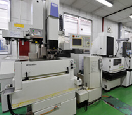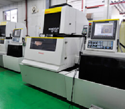マシニング加工をサポートするワイヤー放電加工部門には、精密形状・多面形状加工、および超精密細穴加工を担うべくCHARMILLES放電加工機やMITSUBISHI細穴放電加工機を装備。最終仕上げ工程を担う研磨加工部門では、NC平面研削盤や万能・円筒・内面・成形などの各研削盤、そして外径研磨機、内径研磨機をそろえ、多様な表面処理機能を整えている。
