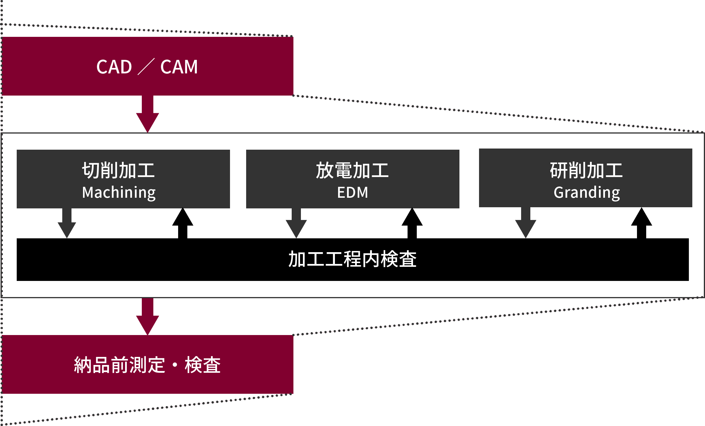 私たちに唯一誇れるものがあるとしたら、それは、社内一貫体制で品質保証できる総合力。素材から切削、熱処理、研磨、表面処理、三次元測定まで、水も漏らさぬ完成度を目指す精神が、どこの部署にも備わっている。