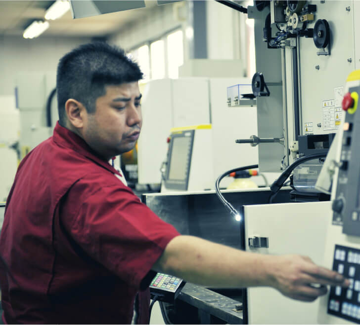 「大きいものだと、厚さ150ミリの鋼材を直径800ミリの円筒形に切り抜いたことがあります。逆のケースは厚さ100分の1ミリの金属板を0.3ミリ四方の正方形に。形状としては角より円弧が難しいです」と話すのは、3台の放電加工機を同時進行で操作する大井淳。「放電加工は、多くがマシニング加工を短縮化するための工程。スタートにポジションするので緊張感があります」。