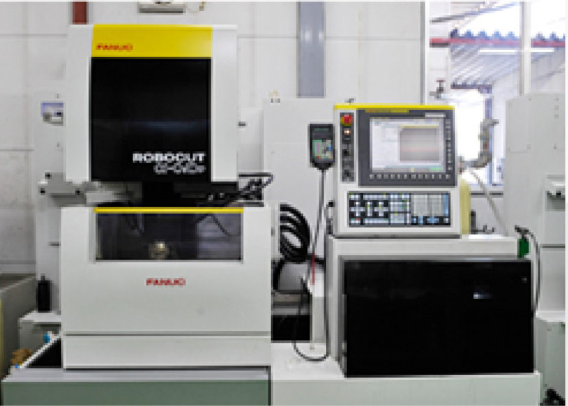 放電加工部門にはCharmilles放電加工機やMITSUBISHI細穴放電加工機などがあり、精密形状・多面形状加工、および超精密細穴加工を担っている。マシニング・切削加工では達成できない深溝・角出し・小径穴・深穴加工も可能で、超硬材・難削材でも精密加工から曲面加工まで対応。多種の工具・治具が不要であり、ワイヤーだけで自在に形状加工できることが特徴となっている。